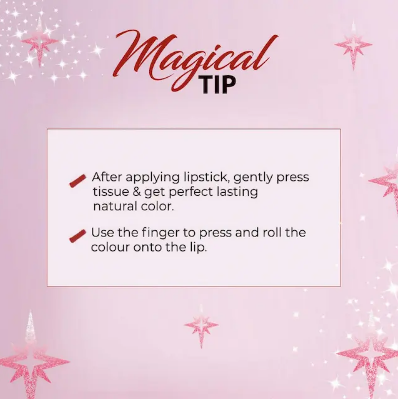 After applying lipstick, gently press a tissue and get perfect lasting natural color.Use the finger to press and roll colour onto the lip