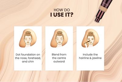 - To apply foundation, start by dabbing small dots of foundation on your nose, forehead, cheeks, and chin.