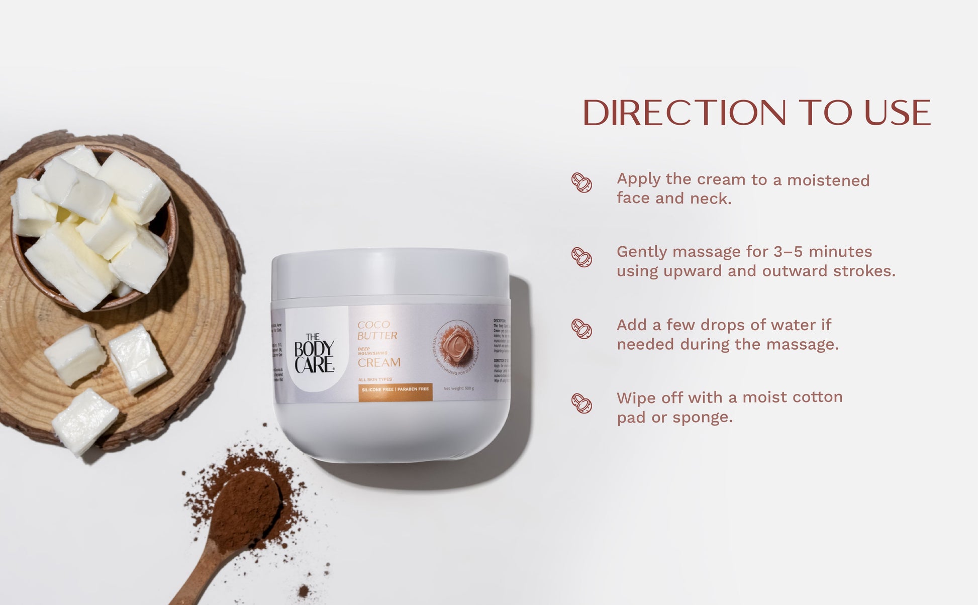 यह कोकोबटर क्रीम आसानी से अवशोषित हो जाती है, रूखी, चिड़चिड़ी, फटी या धूप से झुलसी त्वचा को आराम पहुंचाती है और उसे मुलायम बनाती है। यह आवश्यक नमी संतुलन को बहाल करने और नियंत्रित करने में मदद करती है, रूखी त्वचा और झुर्रियों को रोकती है। कोको बटर खिंची हुई त्वचा को फिर से जीवंत करने में भी मदद करता है। यह आवश्यक उत्पाद आपके स्किनकेयर कलेक्शन में होना ही चाहिए।