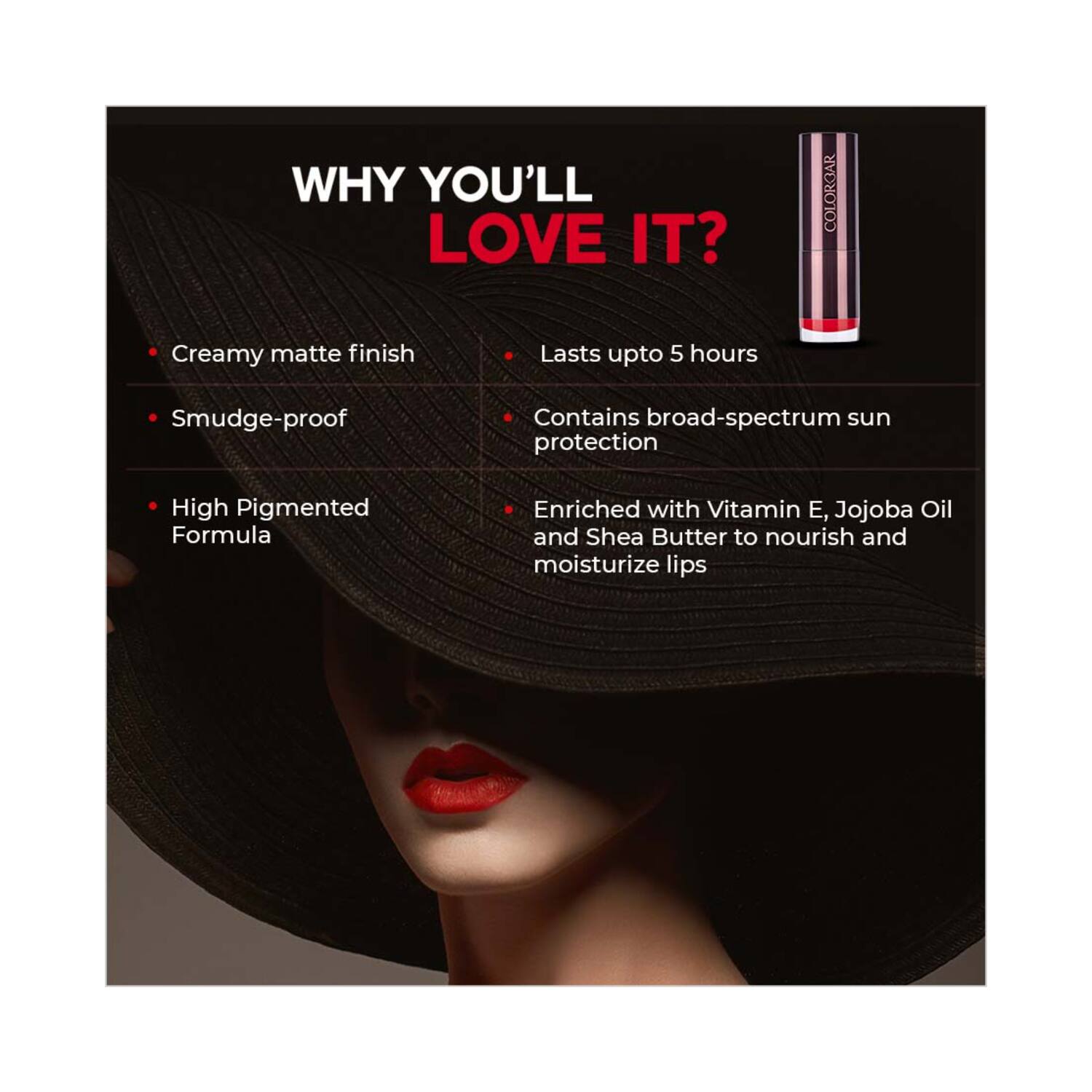 - अत्यधिक रंगद्रव्य वाली लिपस्टिक समृद्ध, मैट रंग प्रदान करती है जो बिना धुंधलाए 5 घंटे तक टिकी रहती है