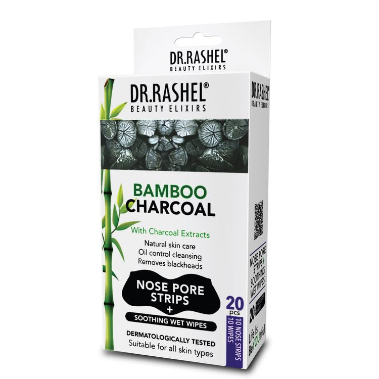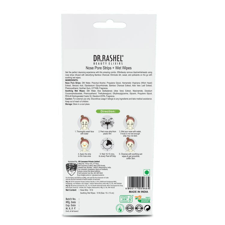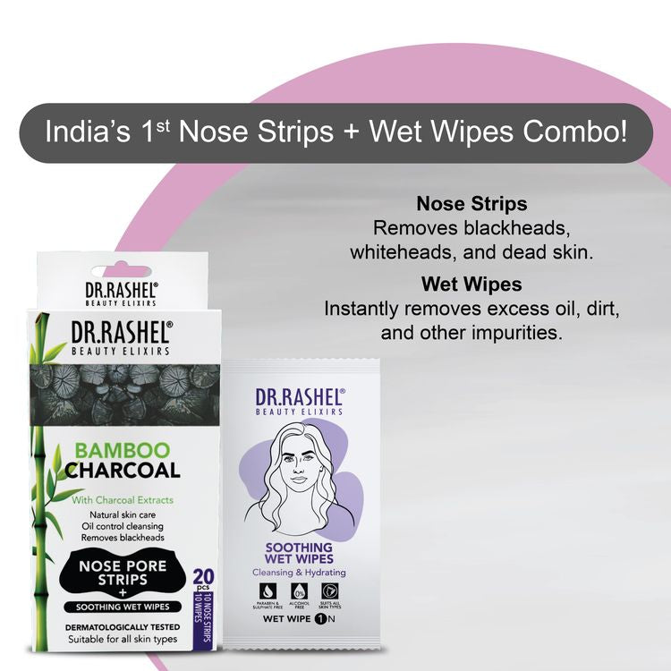 Unclog and refresh with the DR.Rashel Charcoal Nose Strips & Soothing Wet Wipes Combo Pack. This dual-action skincare solution is designed to deep-clean your pores and soothe your skin in one convenient pack. The Charcoal Nose Strips effectively pull out blackheads, whiteheads, and impurities from your nose, leaving it smooth and clear. The Soothing Wet Wipes, infused with aloe vera extracts, castor oil, and glycerin, gently cleanse and refresh your skin without leaving it dry or rough. Perfect for all skin types, this combo is a must-have for your skincare routine.