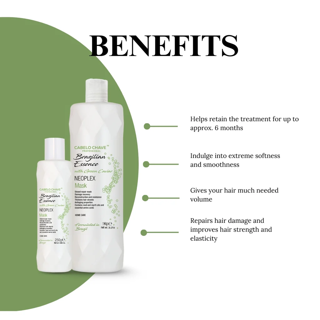 Neoplex mask is enriched with Green caviar, proteins, Biotin and highly effective moisturizing ingredients like Hyaluronic acid, Reed and Myrrh oils, Hydrolysed Wheat Proteins, Olive oil, Cinnamon bark extract and Vitamin E.