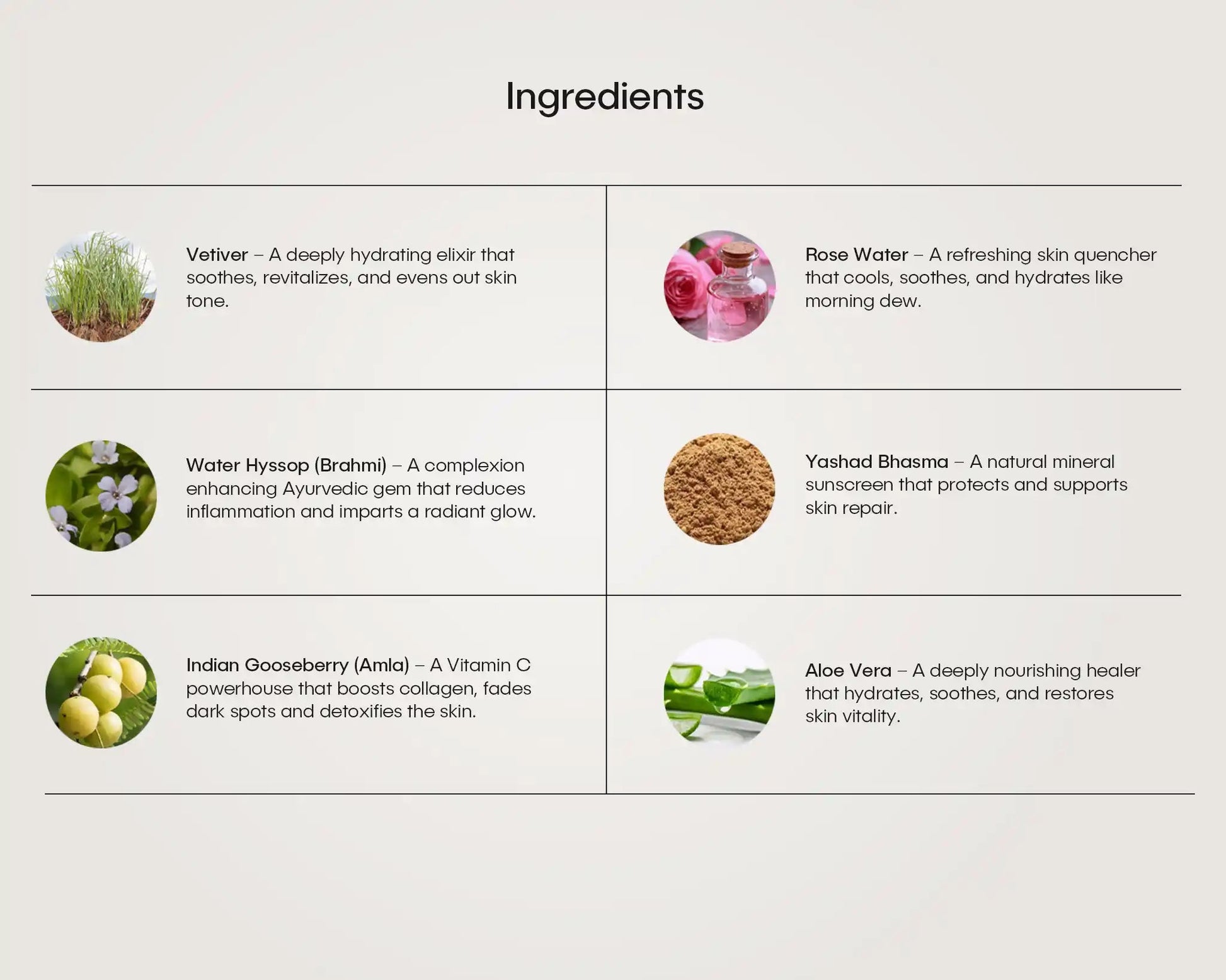 Rose Water (Rosa damascene, Fl.), Vetiver (Chrysopogon zizanioides, Rt.), Aloevera (Aloe barbadensis, Lf.), Brahmi (Centella asiatica, Wh. Pl.), Indian Gooseberry (Emblica officinalis, Fr.), Yashad Bhasma, Vitamin C, Cream base.