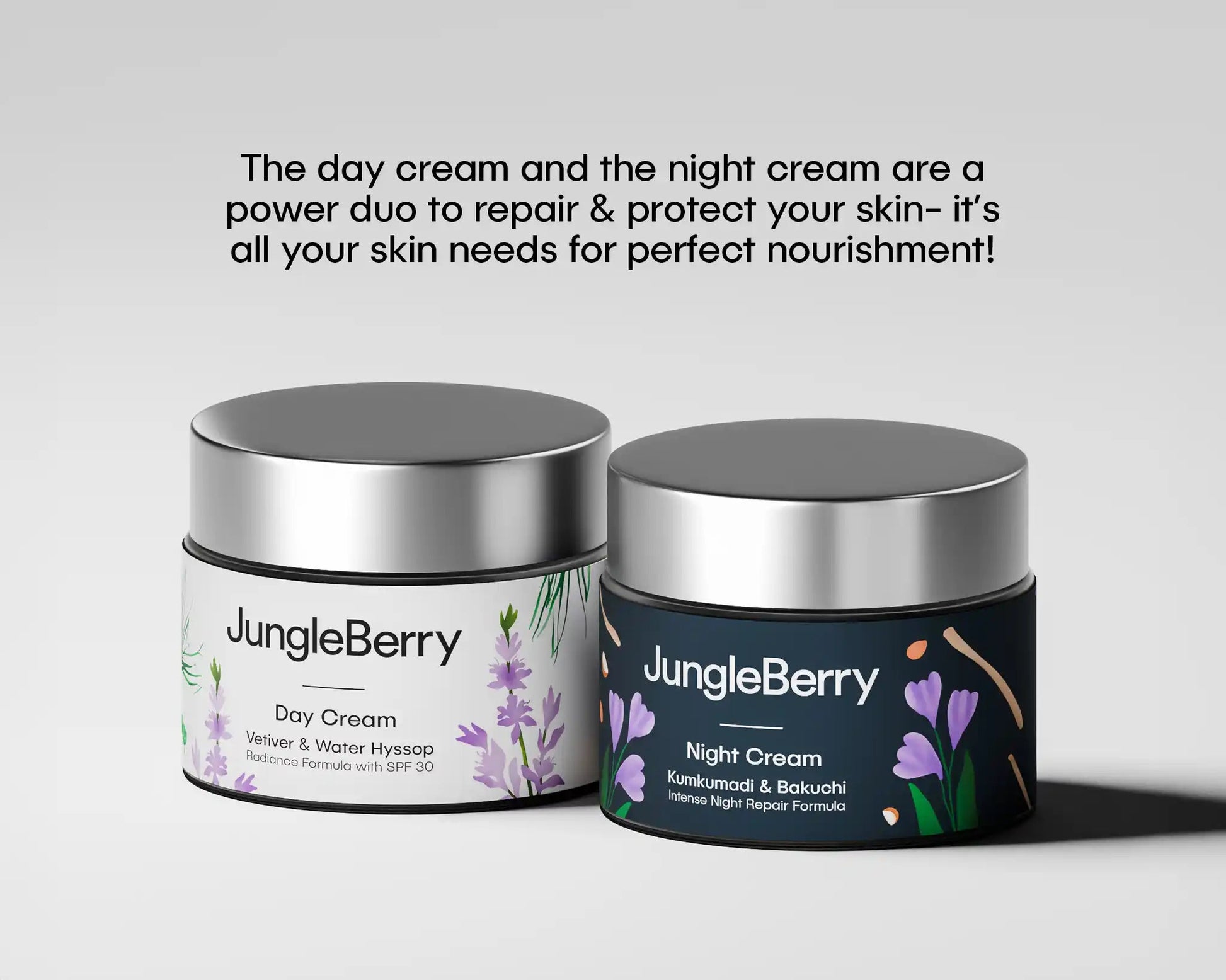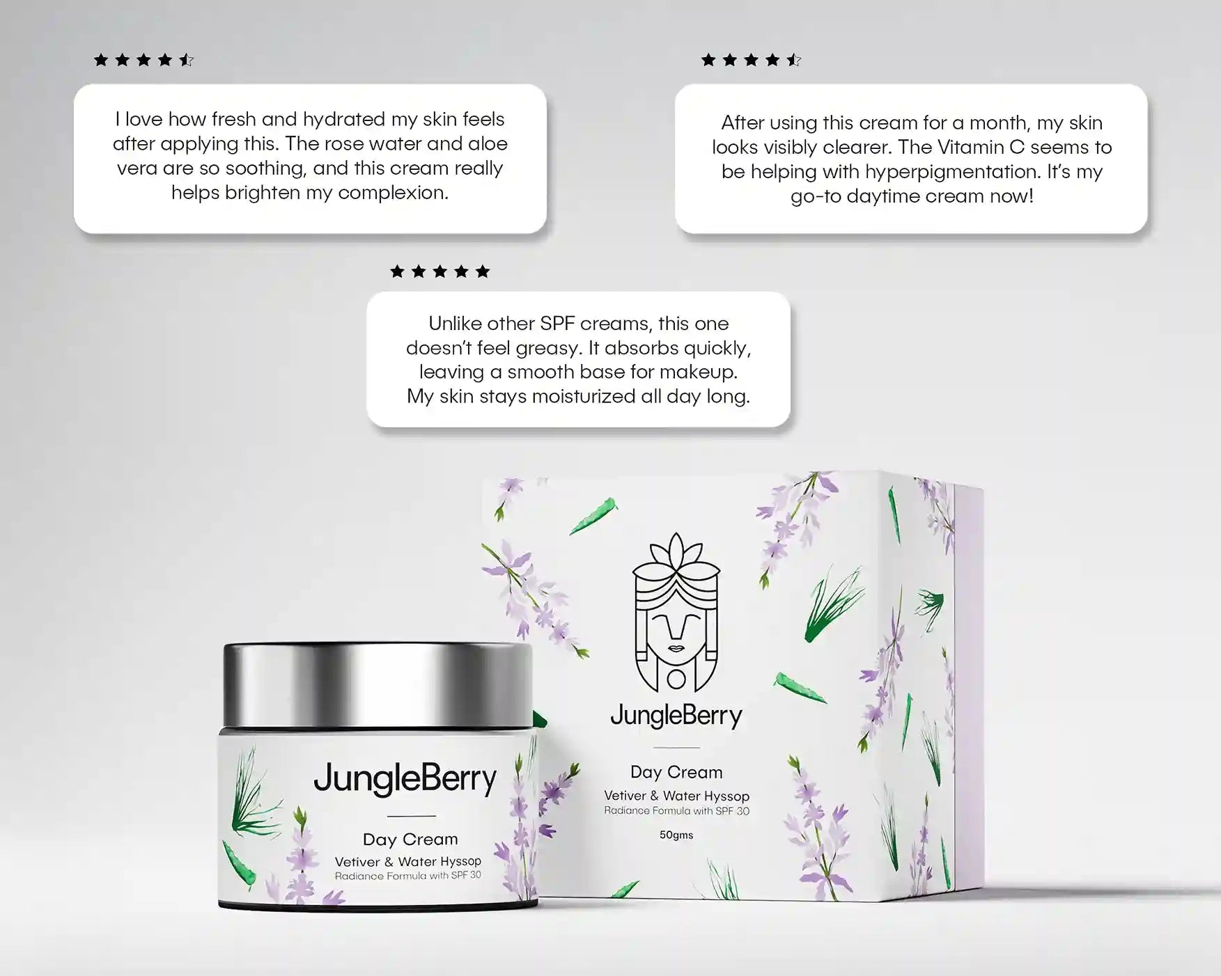 Fortified with Vitamin C, the Vetiver & Water Hyssop Day Cream is a skin-perfecting elixir that works wonders to brighten and even out your skin tone. Infused with the cooling essence of Vetiver and Aloevera, it deeply hydrates, leaving your skin soft, nourished and glowing. Prized as a Pitta-balancing herb in Ayurveda, Vetiver calms acne-prone skin and tightens pores. The restorative blend of Brahmi and Rose Water reduces the appearance of fine lines and wrinkles while Yashad Bhasma provides natural SPF protection, keeping the skin shielded and radiant all day long. Brimming with etherified Vitamin C that works in synergy with its natural Amla counterpart, this cream penetrates deeply, to fade dark spots and blemishes, and reduces hyperpigmentation.