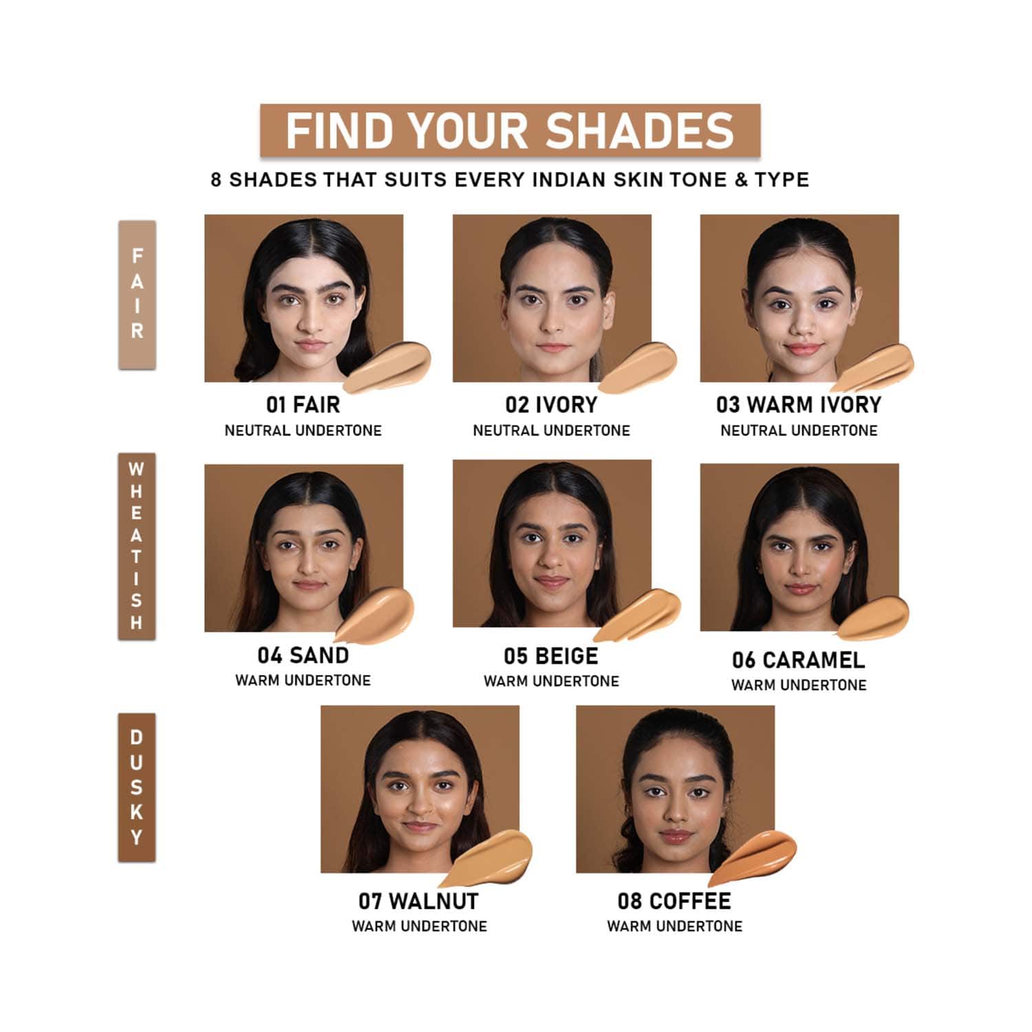 - पूर्ण कवरेज फाउंडेशन जो दाग-धब्बों और त्वचा की बनावट को ढककर एक समान रंगत प्रदान करता है