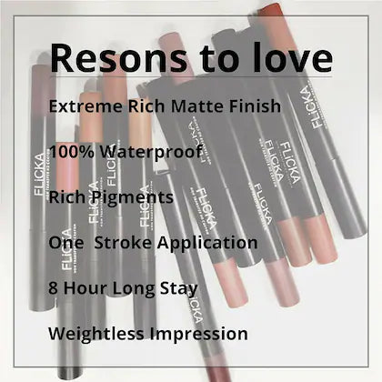 फ्लिका लास्टिंग लिपसेंस मैट लिप क्रेयॉन्स एक्सट्रीम रिच क्रीमी मैट लिप क्रेयॉन्स की एक श्रृंखला है जिसमें बेहतरीन मैट शेड्स हैं। यह बेहतरीन फ़ॉर्मूला आपके होंठों पर आसानी से ग्लाइड होता है और आपको वह क्रीमी मैट फ़िनिश देता है जो आप हमेशा से चाहते थे! ये 12 शेड्स विशेष रूप से फ्लिका द्वारा सभी भारतीय स्किन टोन के अनुरूप बनाए गए हैं। लंबे समय तक चलने वाला, नॉन ट्रांसफर, स्मज-प्रूफ़ लिप फ़ॉर्मूला जिसमें फुल-कलर पे-ऑफ़ है।
