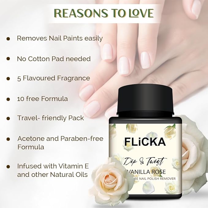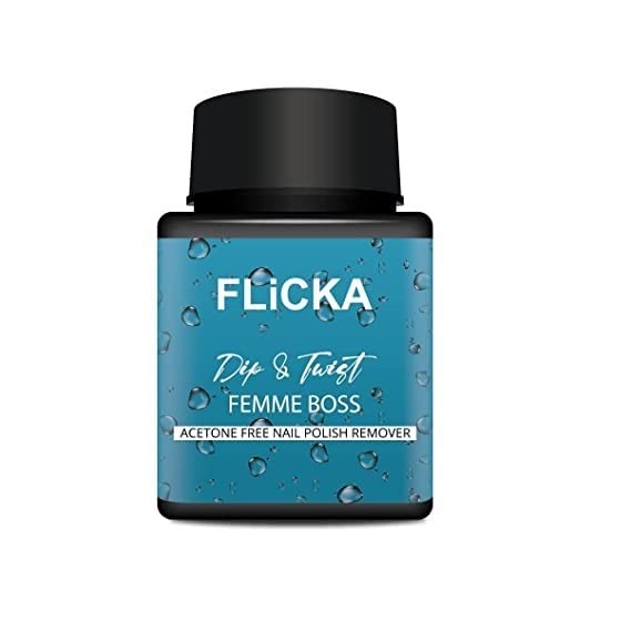 डिप एंड ट्विस्ट इनेमल रिमूवर पेश है FLiCKA डिप एंड ट्विस्ट इनेमल रिमूवर, बिना किसी झंझट के यात्रा के लिए अनुकूल नेल पेंट रिमूवर। अब आपको अपने नेल पेंट को हटाने के लिए कॉटन बॉल या मेकअप रिमूवर पैड की तलाश करने की ज़रूरत नहीं है। इसमें एसीटोन और पैराबेन-मुक्त फ़ॉर्मूला है, इसलिए आपको नाखून के नष्ट होने, सूखने, टूटने या किसी भी तरह के नुकसान के बारे में चिंता करने की ज़रूरत नहीं है। FLiCKA डिप एंड ट्विस्ट इनेमल रिमूवर विटामिन ई और अन्य प्राकृतिक तेलों से युक्त है, इसलिए यह सिर्फ़ आप और आपके हाइड्रेटेड, पोषित और नमीयुक्त नाखून हैं। डिप एंड ट्विस्ट आपके नाखूनों को नुकसान पहुँचाए बिना आसानी से नेल पेंट हटाता है। FLiCKA डिप एंड ट्विस्ट इनेमल रिमूवर पाँच सुगंधों में उपलब्ध है, यह आपके नाखूनों को आपकी मनचाही खुशबू देगा।