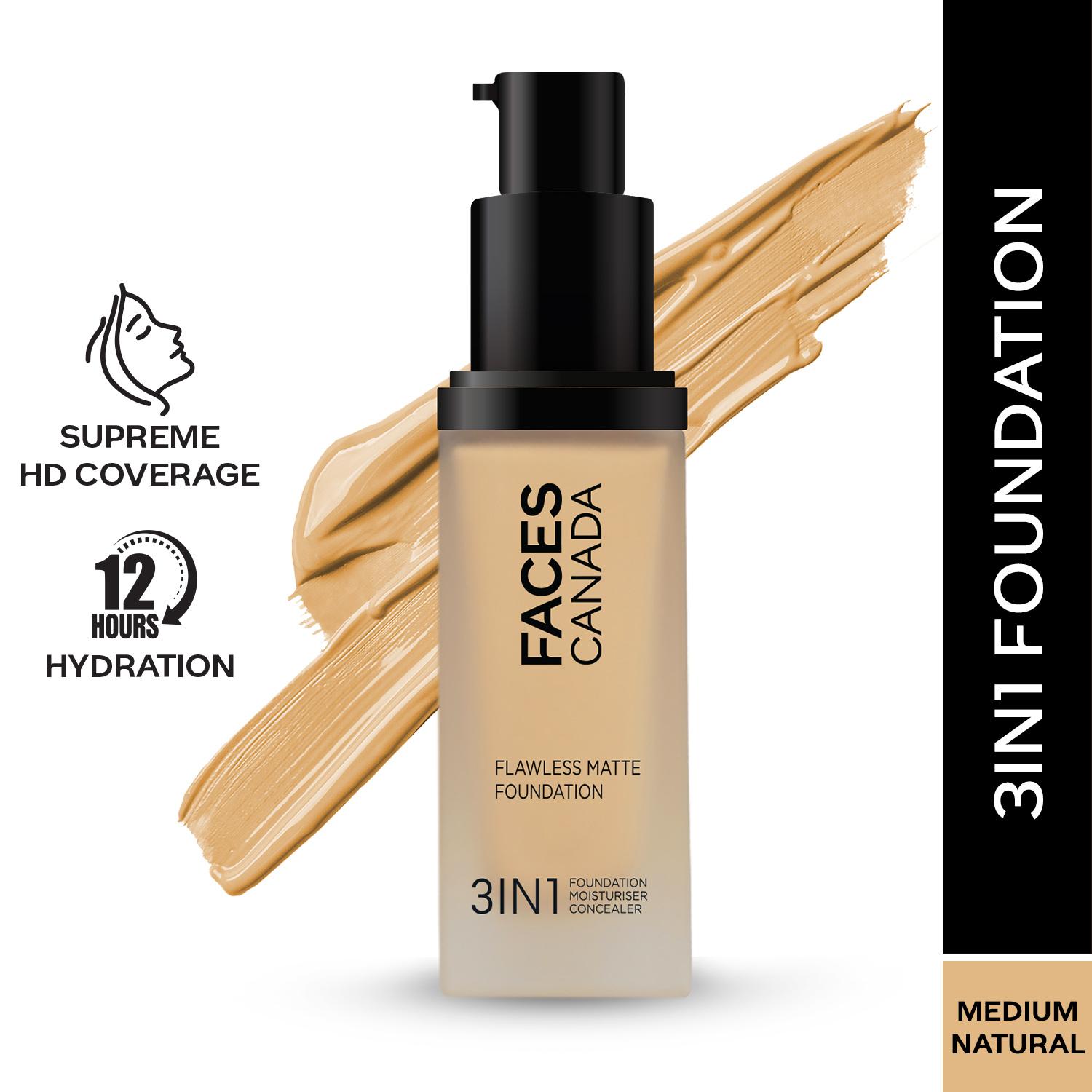 फेसेस कनाडा 3-इन-1 फ्लॉलेस मैट फाउंडेशन SPF 18 - 022 मीडियम नेचुरल (30ml) का उपयोग करके बेदाग मेकअप बेस बनाएं। इस हाइड्रेटिंग फाउंडेशन में एलोवेरा होता है जो पूरे दिन त्वचा को नमीयुक्त रखता है और रंगत निखारने के लिए विटामिन सी होता है। फेसेस कनाडा लिक्विड फाउंडेशन न केवल दाग-धब्बों और काले घेरों को छुपाता है, बल्कि SPF 30 के साथ त्वचा को सूरज की किरणों से होने वाले नुकसान से भी बचाता है। साथ ही, इसमें हल्का फ़ॉर्मूला है जो आसानी से मिल जाता है और प्राकृतिक, मैट फ़िनिश प्रदान करता है।