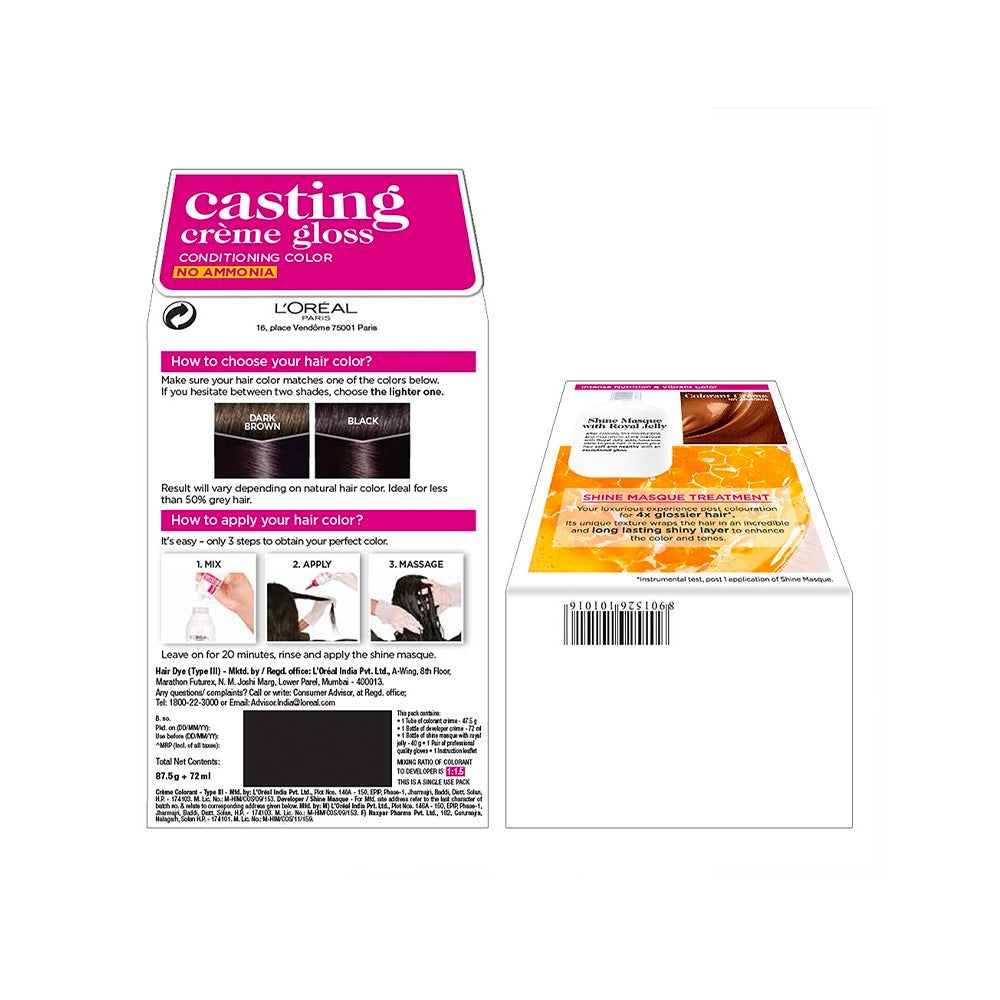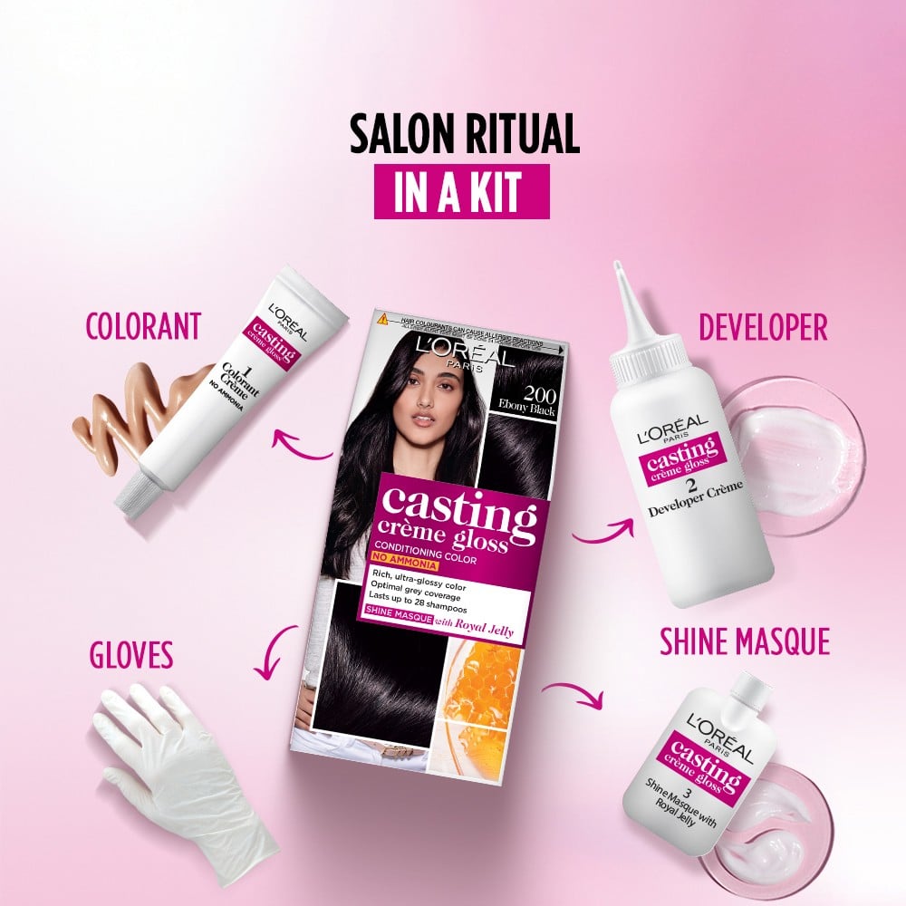 लोरियल कास्टिंग क्रीम ग्लॉस एबोनी ब्लैक शेड (नंबर 200) हेयर कलर से अपने खूबसूरत बालों को प्राकृतिक रंग दें। यह नॉन-अमोनिया हेयर कलर चमकदार टोन और चमकदार चमक देता है। यह एक गहन कंडीशनिंग प्रदान करता है जो लगभग 28 धुलाई तक रहता है।