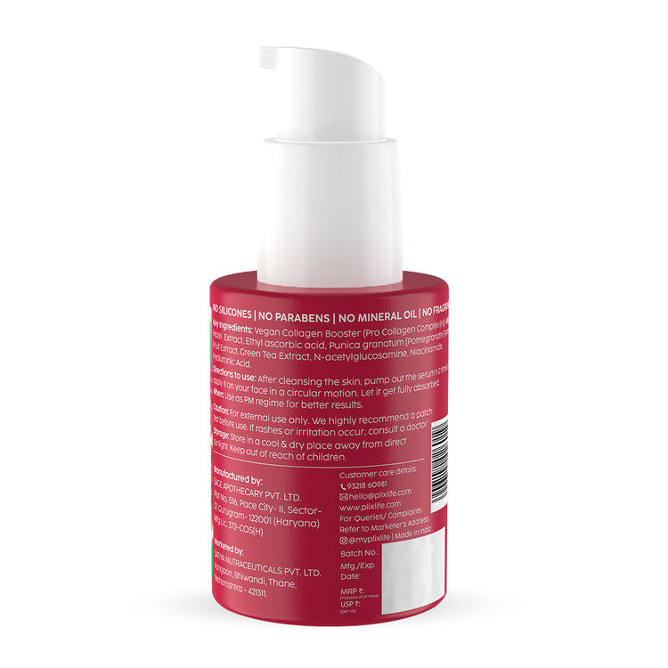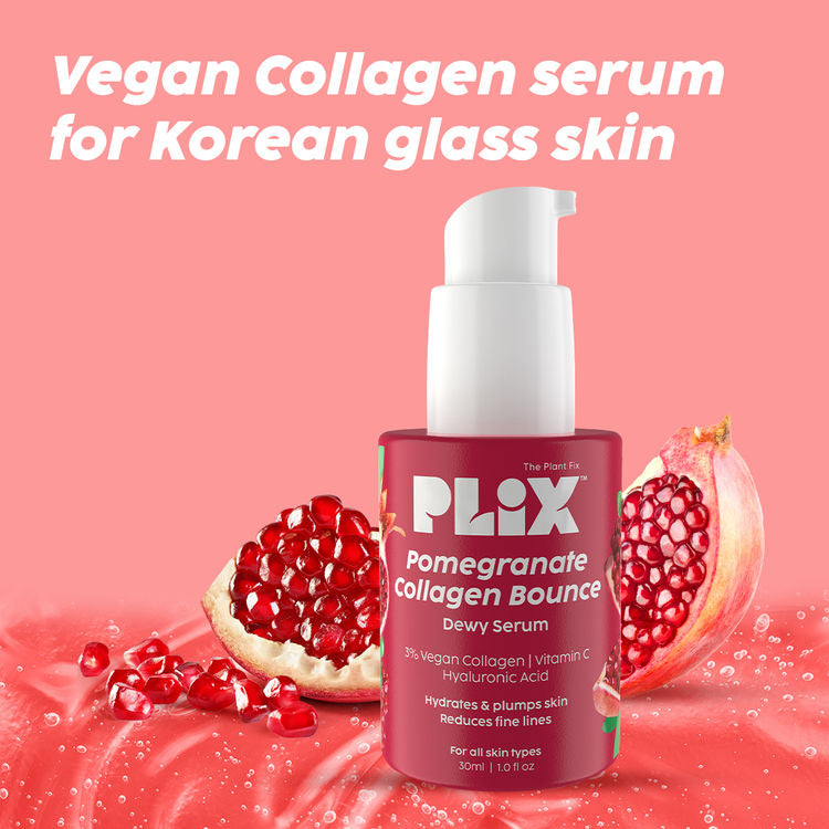 Introducing Plix Vegan Collagen Bounce Serum, a silicone-free & dermatologically tested formula that aims to reduce the appearance of fine lines & wrinkles by enhancing your collagen production & skin elasticity. This lightweight, non-greasy pomegranate+active formula helps revive dull & sagging skin, giving you plump & youthful-looking skin. Experience its illuminating effects that enhance your complexion, leaving your skin radiant & glowing with regular use. This vegan collagen bounce serum enhances your skin's moisture levels, delivering optimal hydration. This helps give your skin a lifted, contoured look. Plix Vegan Collagen Booster Serum enhances your skin’s firmness to reduce sagginess & promote a supple skin texture. Procollagen complex (H) used in this serum is sourced from Daebong Lifescience Co. Ltd. in Incheon, Korea. It acts as a natural skin protein that helps to minimize the appearance of fine lines & wrinkles by targeting sagging skin. With regular use, your skin may regain its elasticity & appear youthful!