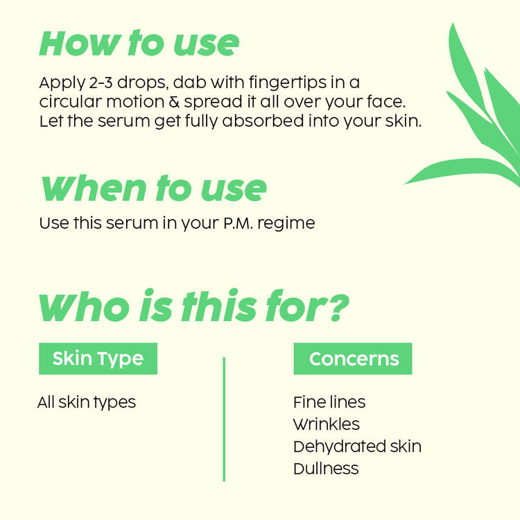Apply 2-3 drops, dab with fingertips in a circular motion & spread it all over your face. Let the serum get fully absorbed into your skin. Use this serum in your P.M. regime.