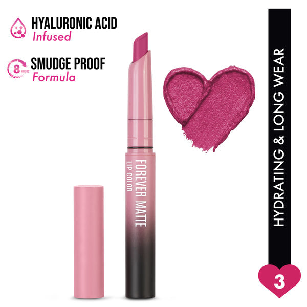 SAY HELLO TO FOREVER MATTE LIP COLOR. Its innovative formula combines bold matte color with long-lasting hydration, thanks to nourishing rice bran butter and hyaluronic acid. Experience soft, smooth lips with a striking, velvety matte finish that glides on effortlessly and stays put for hours. Enjoy vibrant, full coverage and ultimate comfort with Forever Matte, where sophisticated style meets lasting hydration. Rice Bran Butter: Rich in vitamins and antioxidants, it nourishes and soothes your lips, leaving them feeling soft and supple. Hyaluronic Acid: Known for its hydrating properties, it helps to retain moisture, keeping your lips plump and smooth.