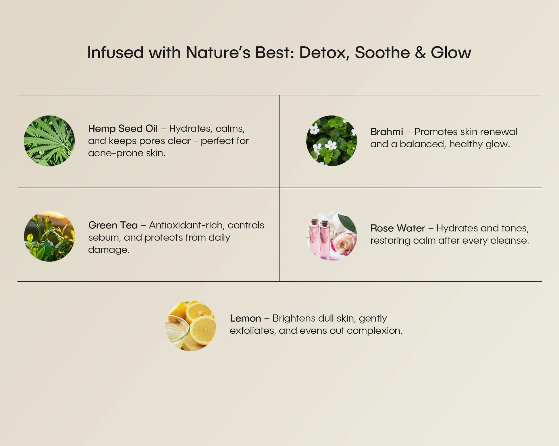 Hemp Seed Oil (Cannabis sativa, Ol.), Green Tea (Camellia sinensis, Lf.), Lemon (Citrus limon, Fr.), Aloe Vera (Aloe barbadensis, Lf.), Rose water (Rosa centifolia, Fl.), Brahmi (Centella asiatica, Wh.pl.), Cleanser Base (Q.S.)