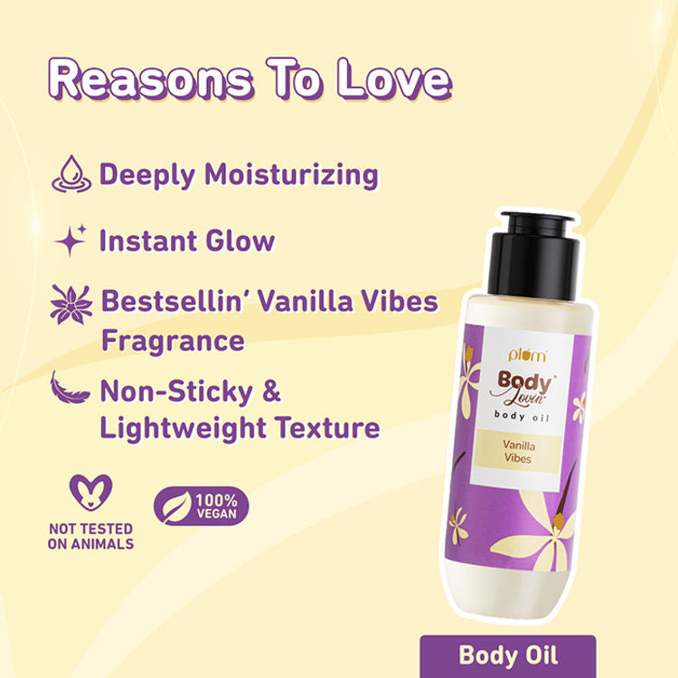 - Vanilla Vibes Body Oil: Apply a generous amount of the body oil to get moisturised skin & an instant glow! Best used post shower.