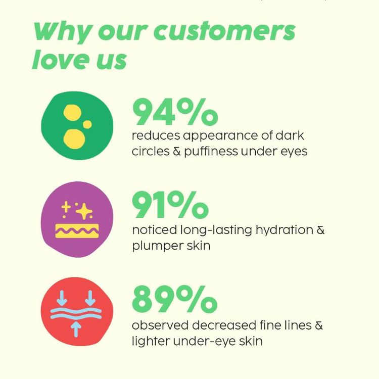 Caffeine: Boosts Blood Circulation around the eye area. Reduces the appearance of dark circles & puffiness.