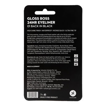 Additional Details: Gloss Boss Eyeliner is a water-based eyeliner free of parabens, IPBC, and formaldehyde-releasing compounds. This product is dermatologically and ophthalmologically tested & approved and 100% safe for your skin. Peels off with warm water - no separate eye makeup remover required. Currently available in the shade " 01 Back to Black". Made in Germany. Net Volume: 2.5 ml.