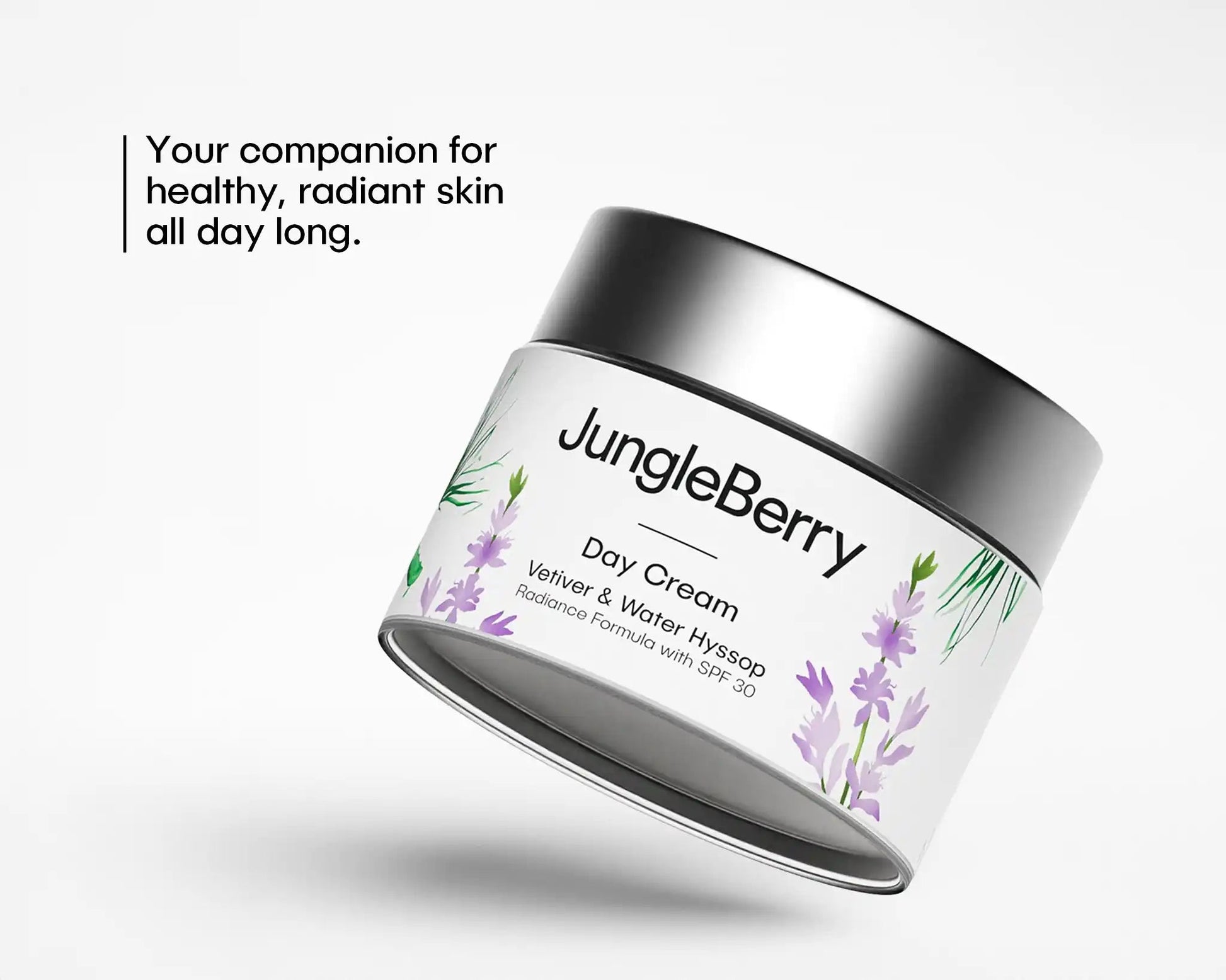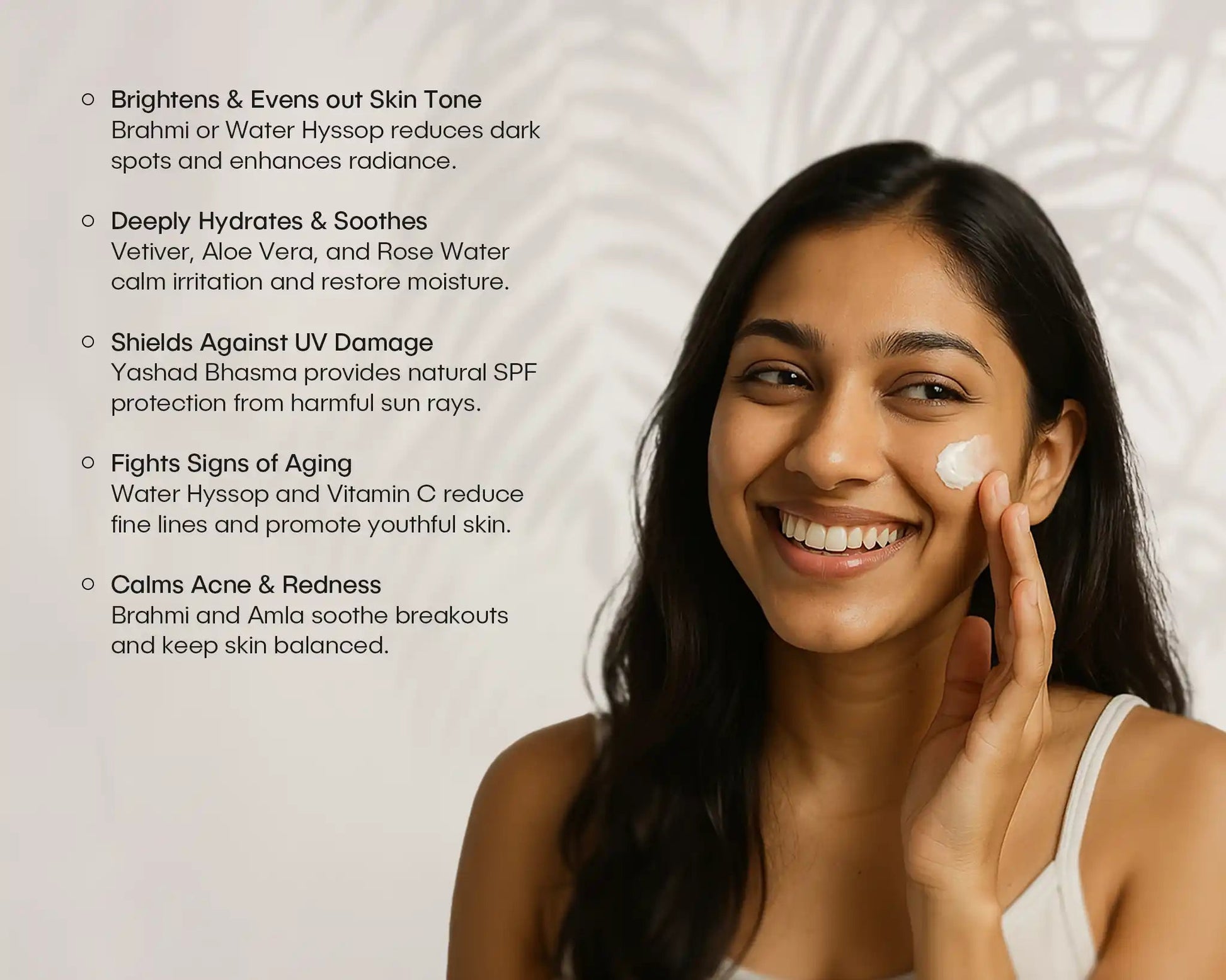 Fortified with Vitamin C, the Vetiver & Water Hyssop Day Cream is a skin-perfecting elixir that works wonders to brighten and even out your skin tone. Infused with the cooling essence of Vetiver and Aloevera, it deeply hydrates, leaving your skin soft, nourished and glowing. Prized as a Pitta-balancing herb in Ayurveda, Vetiver calms acne-prone skin and tightens pores. The restorative blend of Brahmi and Rose Water reduces the appearance of fine lines and wrinkles while Yashad Bhasma provides natural SPF protection, keeping the skin shielded and radiant all day long. Brimming with etherified Vitamin C that works in synergy with its natural Amla counterpart, this cream penetrates deeply, to fade dark spots and blemishes, and reduces hyperpigmentation.