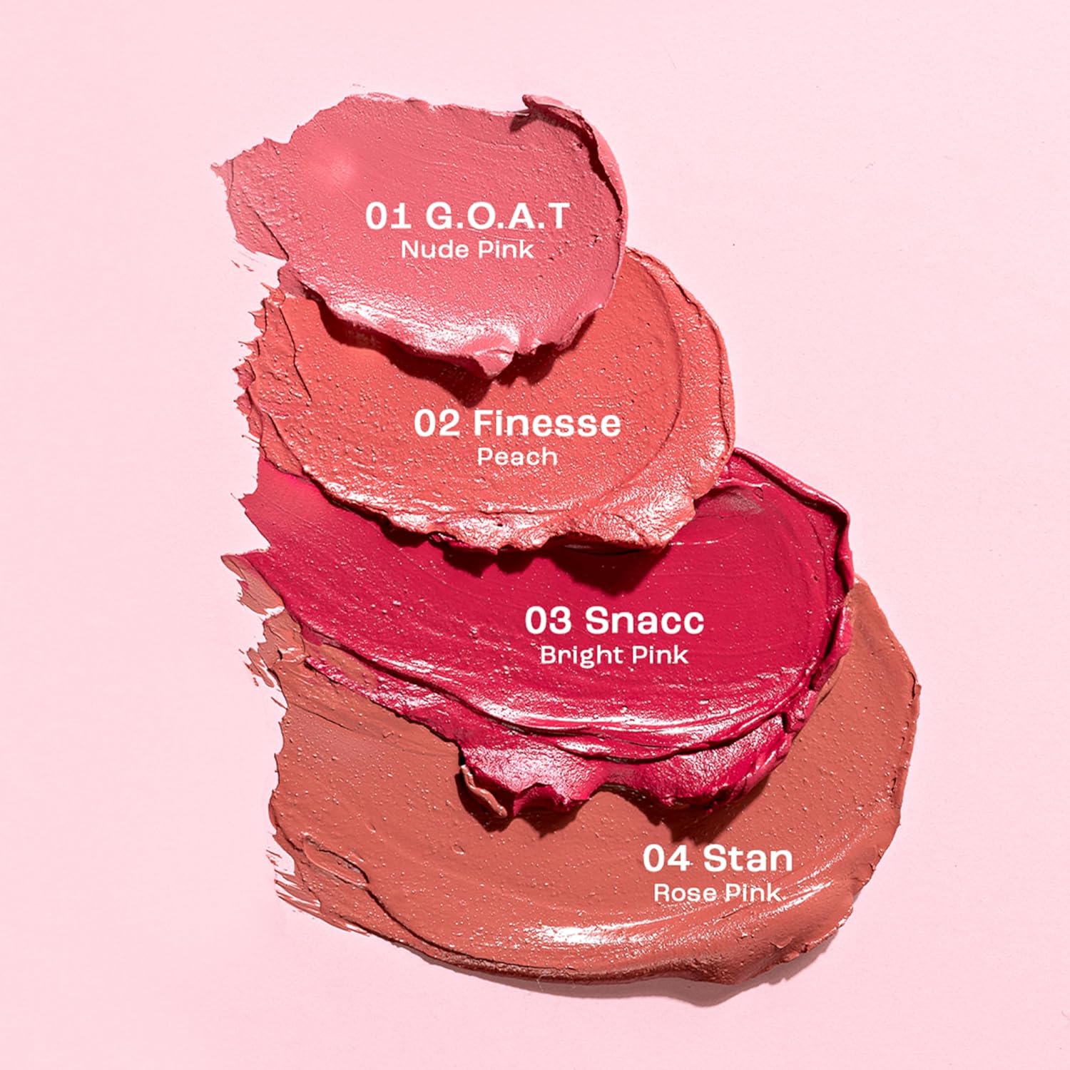 - अपना शेड चुनें: मूड? हमारे पास वह शेड है जो आप चाहते हैं और उससे भी ज़्यादा! इनमें से अपना पसंदीदा चुनें: GOAT - न्यूड पिंक, Finesse - पीच, Snacc - ब्राइट पिंक, और Stan - रोज़ पिंक