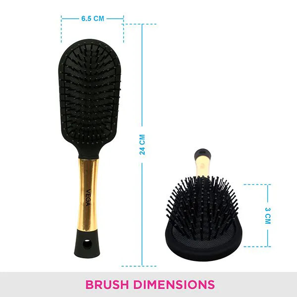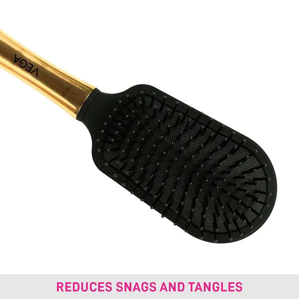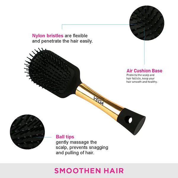 यह वेगा कुशन हेयर ब्रश आपके बालों को संवारने, सीधा करने, चिकना करने और चमक लाने के लिए आदर्श है। स्टे-पुट बॉल टिप्स के साथ नायलॉन ब्रिसल्स आसानी से बालों में प्रवेश करते हैं और उन्हें उत्तेजित करते हैं, सूक्ष्म तरीके से मालिश करते हैं और उलझने और उलझने को कम करने में भी मदद करते हैं। आरामदायक पकड़ के साथ एर्गोनॉमिक रूप से डिज़ाइन किया गया है और छोटे से मध्यम लंबाई तक के बालों के लिए उपयुक्त है।