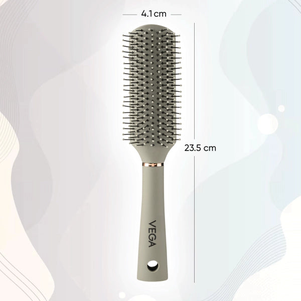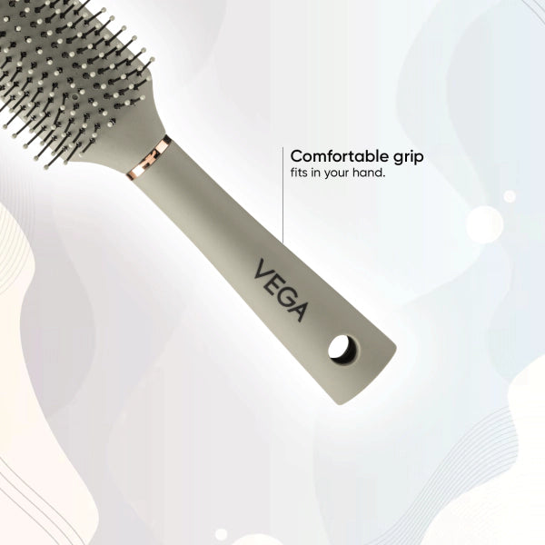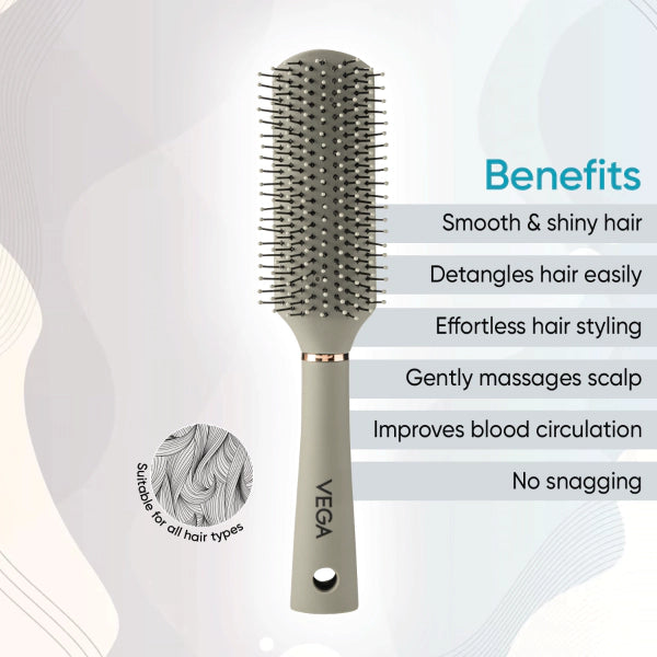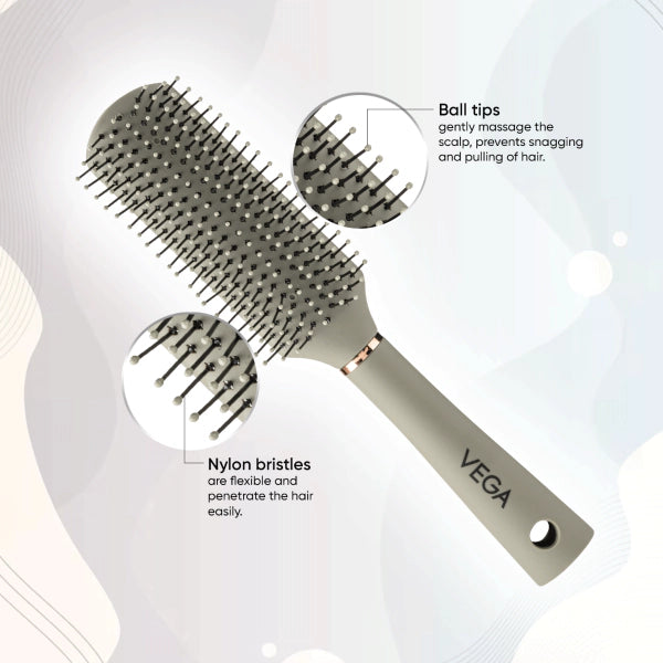बालों के लिए वेगा फ्लैट ब्रश सभी बालों की लंबाई और बनावट को चिकना करता है ताकि आपकी दैनिक हेयर स्टाइलिंग की ज़रूरतों को पूरा किया जा सके। वेगा फ्लैट ब्रश के साथ बालों में आसानी से वॉल्यूम जोड़ें जिसमें बॉल टिप्ड नायलॉन ब्रिसल्स हैं जो धीरे से स्कैल्प की मालिश करते हैं, उलझन को सुलझाते हैं और जड़ों को ऊपर उठाते हैं। हेयर ब्रश सभी प्रकार के बालों के लिए उपयुक्त हैं।