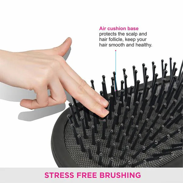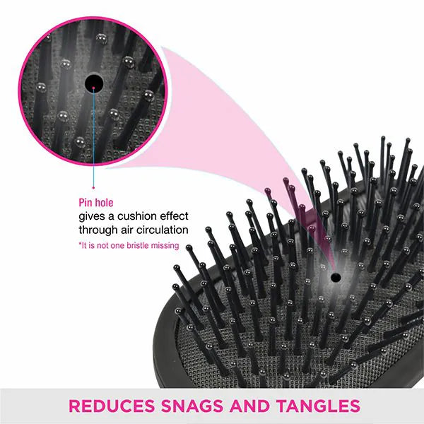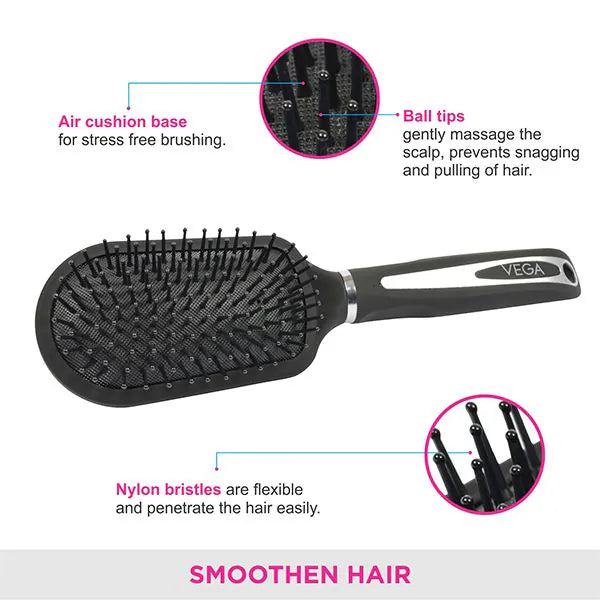 बालों को संवारने, सीधा करने और चिकना करने के साथ-साथ उनकी चमक बढ़ाने के लिए आदर्श। स्टे-पुट बॉल टिप्स के साथ नायलॉन ब्रिसल्स आसानी से बालों में घुस जाते हैं और स्कैल्प को उत्तेजित करते हुए मसाज करने जैसा एहसास देते हैं। यह बालों के उलझने और उलझने को कम करने में भी मदद करता है। सभी प्रकार के बालों और बालों की बनावट के लिए उपयुक्त। आरामदायक पकड़ के साथ एर्गोनॉमिक रूप से डिज़ाइन किया गया है और छोटे से लेकर मध्यम लंबाई तक के बालों के लिए उपयुक्त है। आकर्षक सिल्वर-लाइन वाला हैंडल डिज़ाइन को आकर्षक लुक देता है।