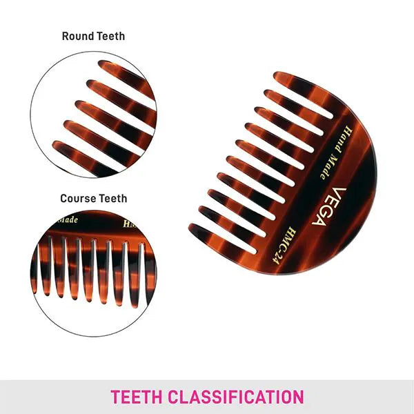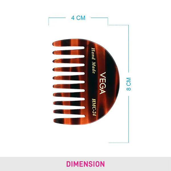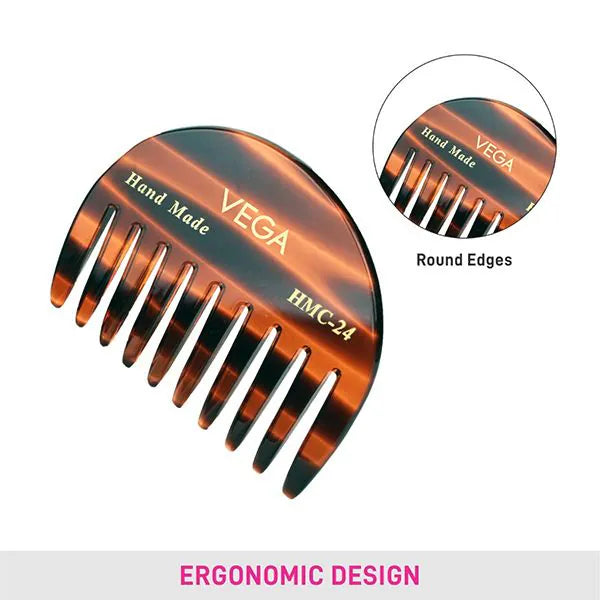 वेगा हस्तनिर्मित कंघी सेल्यूलोज एसीटेट से बनाई जाती है जो अपने गैर-पेट्रोलियम आधारित सामग्री के कारण बालों में स्थैतिक चार्ज नहीं बनाती है, जो प्राकृतिक पौधों से प्राप्त होती है। इसमें चिकने गोल दांत होते हैं जो कंघी करते समय आपके स्कैल्प को चोट नहीं पहुँचाते हैं और बालों का झड़ना कम करने में मदद करते हैं। यह स्कैल्प पर कोमल है और संवेदनशील त्वचा के लिए आदर्श है और चमक जोड़ते हुए स्टाइल बनाने में मदद करता है