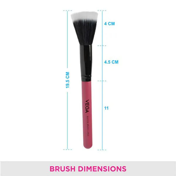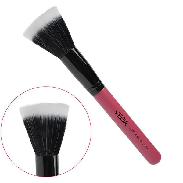 वेगा बफर ब्रश एक बड़ा, पूर्ण गोलाकार ब्रश है जिसका उपयोग हल्के वजन के अनुप्रयोग और त्वचा में बनावट जोड़ने के लिए फेस पाउडर के मिश्रण के लिए किया जाता है। वेगा द्वारा काले फेरूल के साथ एक आकर्षक गुलाबी रंग में यह प्रीमियम मेकअप ब्रश अल्ट्रा-सॉफ्ट बालों से बनाया गया है जो अविश्वसनीय स्पर्श और एहसास प्रदान करता है।