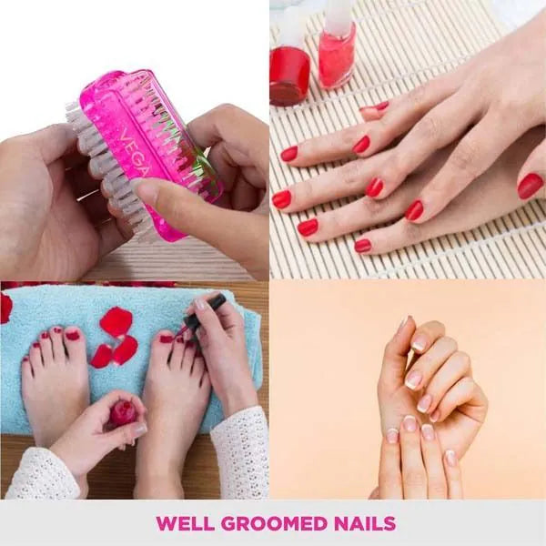 नाखूनों के ऊपरी भाग की सफाई के लिए मुलायम ब्रिसल्स वाला दो-तरफा नेल ब्रश , तथा नाखूनों के नीचे की सफाई के लिए छोटे सख्त ब्रिसल्स वाला ब्रश।