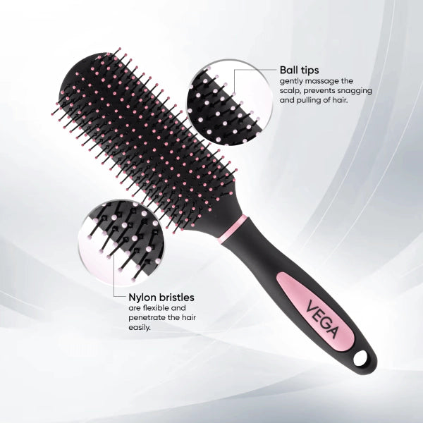 बालों के लिए वेगा फ्लैट ब्रश सभी बालों की लंबाई और बनावट को चिकना करता है ताकि आपकी दैनिक हेयर स्टाइलिंग की ज़रूरतों को पूरा किया जा सके। वेगा फ्लैट ब्रश के साथ बालों में आसानी से वॉल्यूम जोड़ें जिसमें बॉल टिप्ड नायलॉन ब्रिसल्स हैं जो धीरे से स्कैल्प की मालिश करते हैं, उलझन को सुलझाते हैं और जड़ों को ऊपर उठाते हैं। हेयर ब्रश सभी प्रकार के बालों के लिए उपयुक्त हैं।