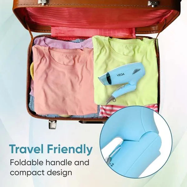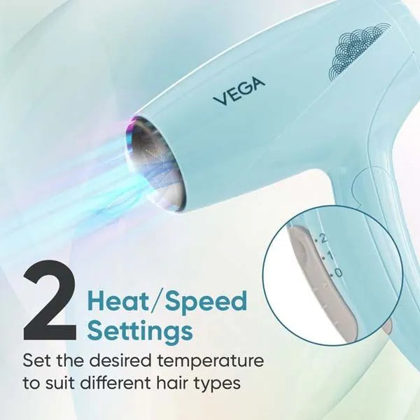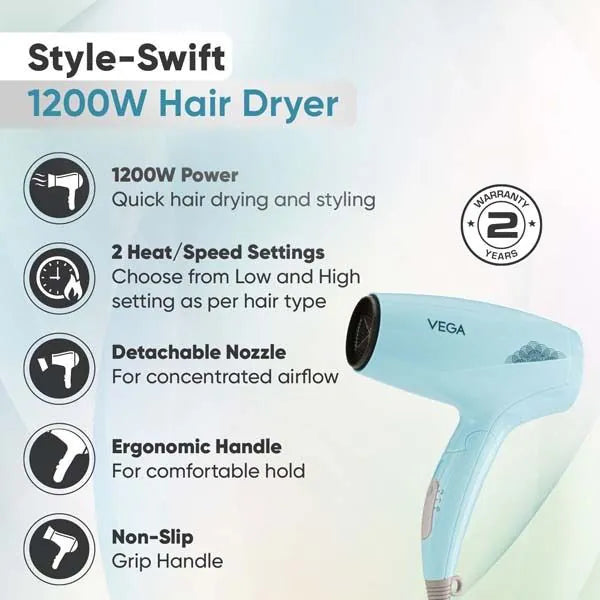 Pave your way to beautiful-looking hair strands by adding Vega Style Swift Hair Dryer to your beauty stash. Featuring a concentrator nozzle and 2 heat/speed settings, you can enjoy effective results in minutes with no frizzy strands. Its 1000-1200W powerful motor delivers a smooth hair finish at home and on the go, thanks to its foldable handle which makes it compact and easy to store and carry safely. Other features of this power-packed hair dryer include zig-zag winding, a removable end cap, overheat protection and a detachable nozzle.