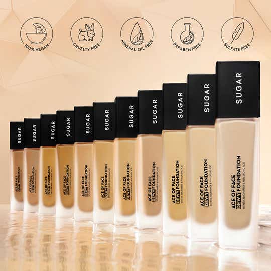Illuminate your complexion with the SUGAR Cosmetics Ace Of Face Dewy Foundation - 07 Vanilla Latte (30 ml). This multi-functional foundation combines the benefits of a foundation, BB cream, and concealer in one, delivering smooth, even coverage with a dewy finish. Enriched with 5% niacinamide, vegan collagen, and hyaluronic acid, the SUGAR Cosmetics foundation hydrates and maintains moisture while blurring imperfections. Also, the lightweight, oil-free, and fragrance-free foundation provides long-lasting, 12-hour wear without clogging pores.