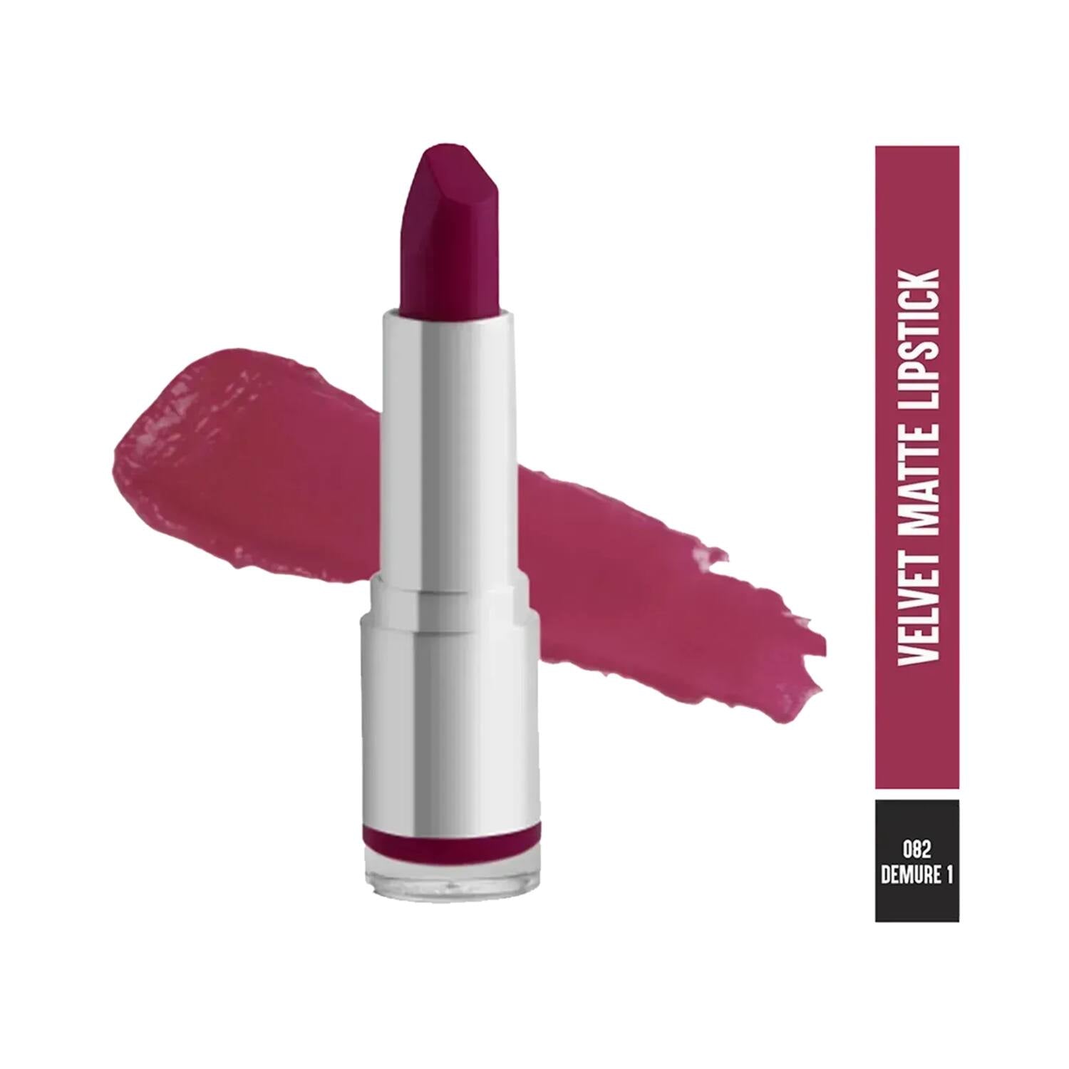 Paint your pout the perfect hue with the Colorbar Velvet Matte Lipstick - Demure-1-082 (4.2 gm.) This 2-in-1 matte lipstick is creamy on application and matte when it dries. It glides on smoothly and stays true for upto 5 hours. It is enriched with shea butter, jojoba oil, and vitamin E that help nourish and moisturize your lips. This highly pigmented lipstick offers broad-spectrum sun protection and is dermatologically tested for safe use.