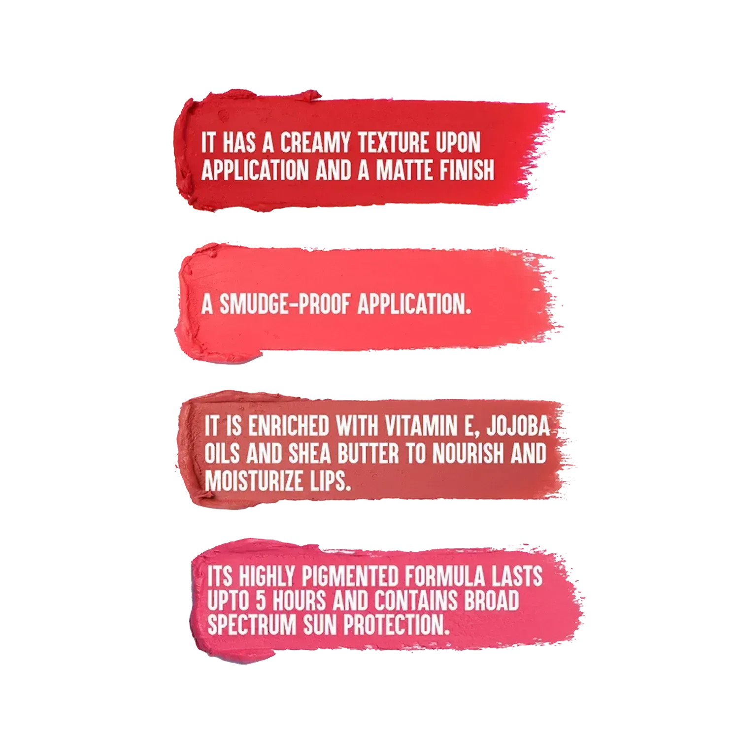 Give your lips a beautiful makeover in minutes with the Colorbar Velvet Matte Lipstick - Check Mate-111 (4.2 gm.) This 2-in-1 matte lipstick is creamy on application and matte when it dries. It glides on smoothly and stays true for upto 5 hours. It is enriched with shea butter, jojoba oil, and vitamin E that help nourish and moisturize your lips. This highly pigmented lipstick offers broad-spectrum sun protection and is dermatologically tested for safe use.