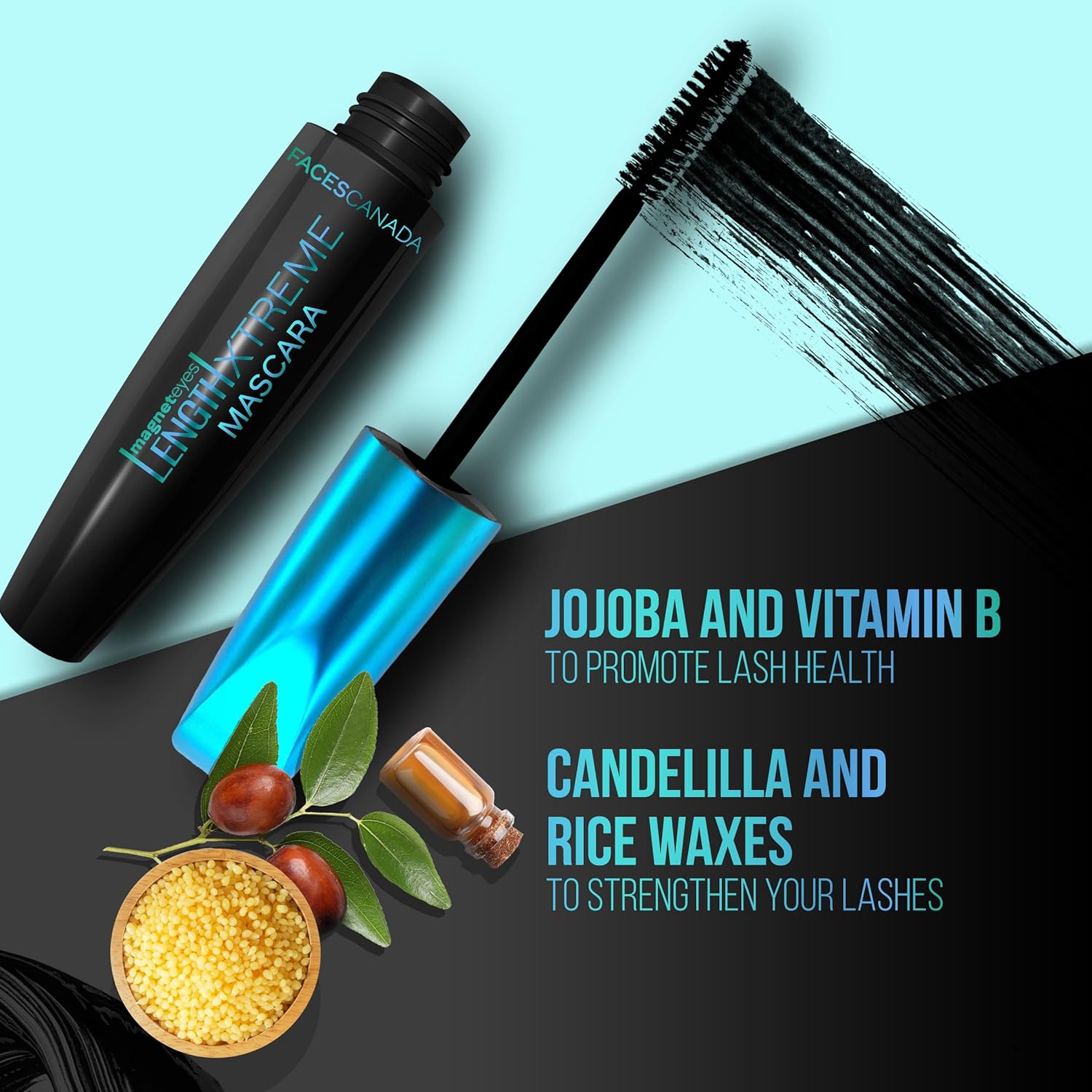- INGREDIENTS: Our mascara is infused with Jojoba and Vitamin B to promote lash health and enhance their natural beauty. Also enriched with Candelilla and Rice Waxes which helps to condition and strengthen your lashes.