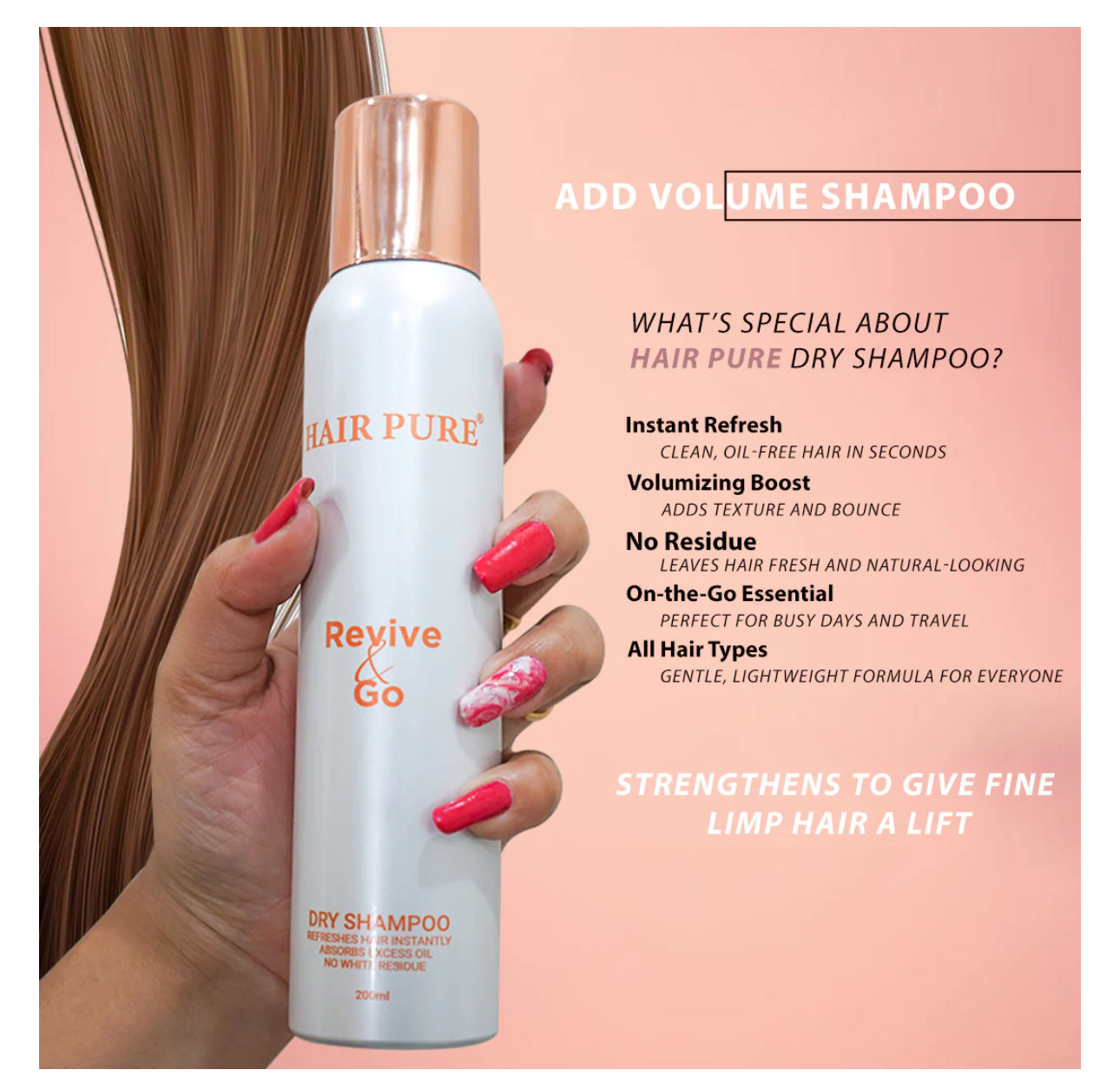 Hair Pure Revive & Go Dry Hair Shampoo is formulated to deliver a volumizing boost to flat, lifeless