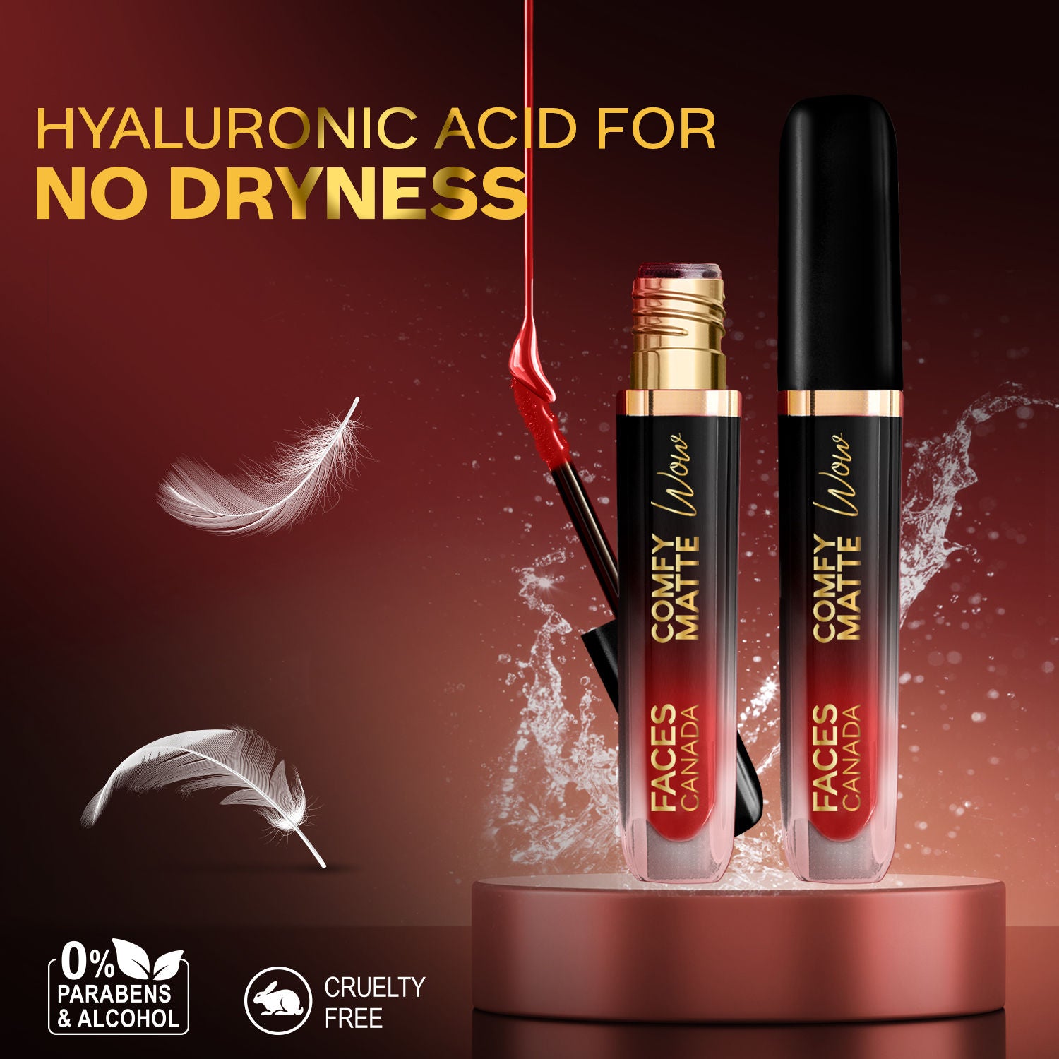 The Faces Canada Comfy Matte Wow liquid lipstick range, where comfort meets style in a collection designed to elevate your every look. Crafted with care and precision, this range offers ten luxurious shades, each carefully curated to complement a spectrum of skin tones, from fair to deep, ensuring there's a perfect match for everyone.Indulge in a palette that spans from rich browns to flirtatious pinks, classic reds to sultry maroons, and versatile nudes, providing endless possibilities for every occasion and mood. Whether you're aiming for a subtle everyday elegance or a bold statement, the Faces Canada Comfy Matte Wow range has you covered.Formulated for lasting power, these liquid lipsticks boast an all-day stay and a long-lasting transferproof formula, ensuring your lips remain flawlessly adorned from morning coffee to evening cocktails. Bid farewell to frequent touch-ups as you enjoy the confidence of vibrant color that stays put through it all. But what truly sets Faces Canada Comfy Matte Wow apart is its commitment to inclusivity. Created with Indian skin tones and dark skin tones in mind, each shade is meticulously crafted to enhance the natural beauty of all complexions, embracing diversity and celebrating individuality.Discover the allure of comfort and sophistication with Faces Canada Comfy Matte Wow liquid lipstick range, where every swipe is an invitation to embrace your unique style and leave a lasting impression.