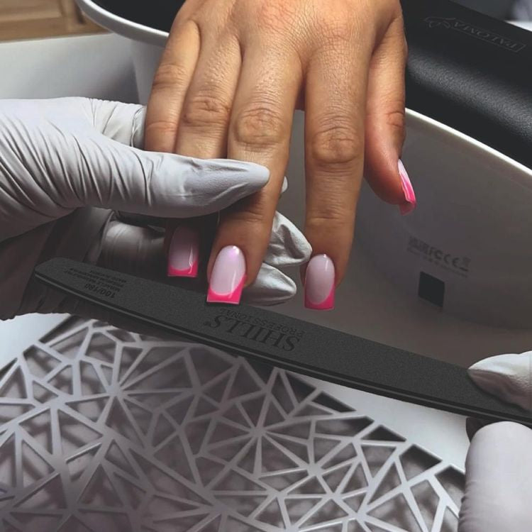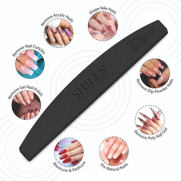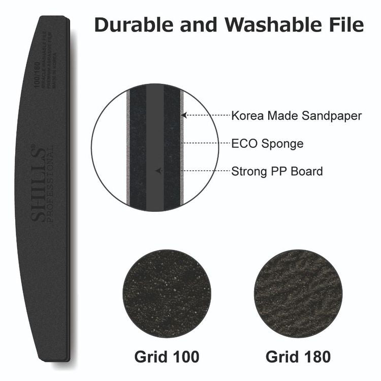 Shills Professional Half-Moon-Shaped Filer Grid - 100/180, which is ideal for filing nail tips and extensions. This filer is not only comfortable to grip but also incredibly easy to use. It is made of high-quality sandpaper, which makes it very wear-resistant and durable. Moreover, it is washable and practical. Simply rinse it with water after use, and it's ready to go again. This portable and practical filer is definitely a must-have!
