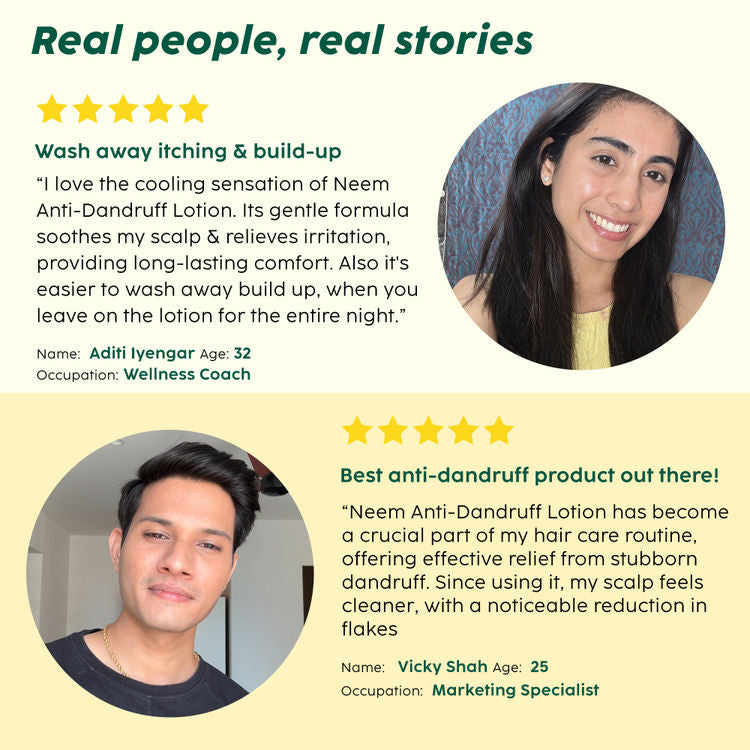 Neem Anti-Dandruff Advanced Lotion is a potent overnight solution formulated to deliver lasting relief from dandruff and itching. Enriched with Dandelix Pro™, which is known to eliminate 72% of visible flakes within just one week, along with Ichthyol® PALE, Tea Tree Oil, and Neem Extract, this lotion works to tackle dandruff at its root. Dandelix Pro™ inhibits fungal growth, while Ichthyol® PALE balances sebum production, reducing excess oil and calming redness and itching. The addition of Tea Tree Oil and Neem Extract further enhances its antifungal and soothing properties, making it an ideal solution for those with persistent dandruff, seborrheic dermatitis, or scalp itchiness. This advanced formula also prevents the dandruff recurrence by maintaining scalp moisture and promoting a healthy, balanced environment. Suitable for all hair types, Neem Anti-Dandruff Advanced Lotion is gentle enough for regular use and safe for coloured hair, ensuring that your scalp remains flake-free, hydrated, and comfortable. *Based on efficacy of active Dandelix Pro tested standalone.